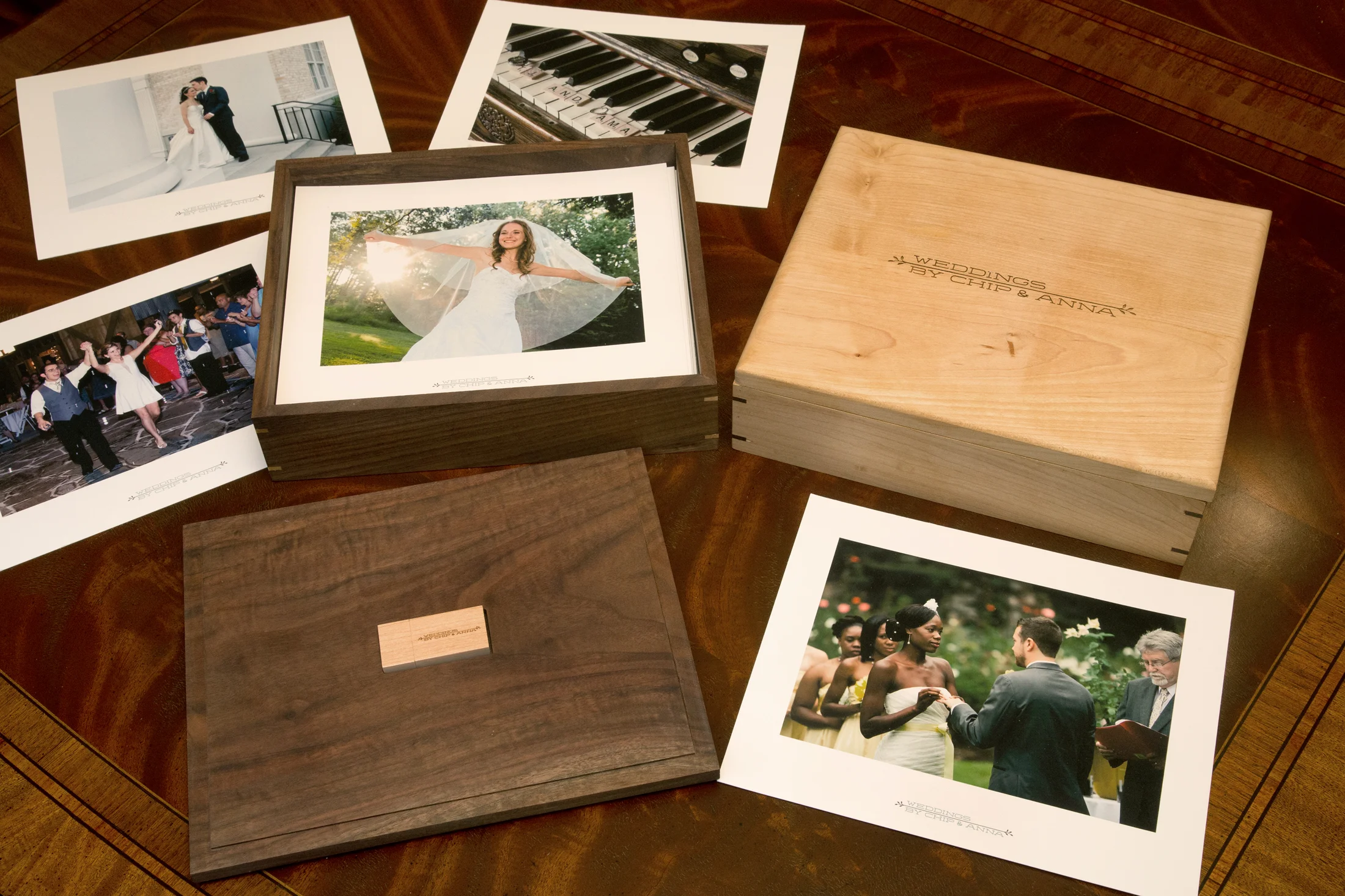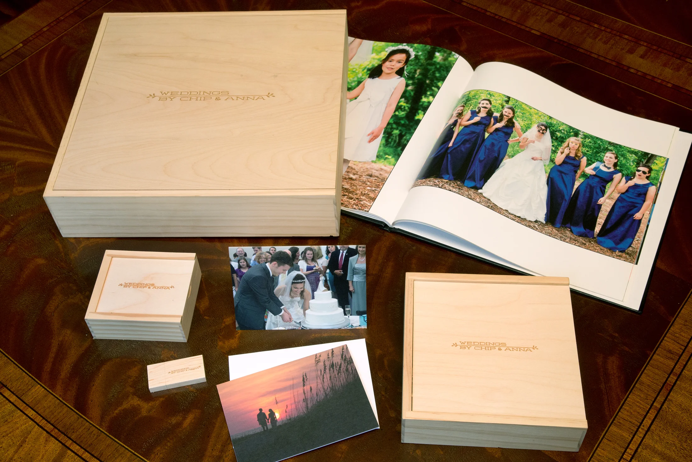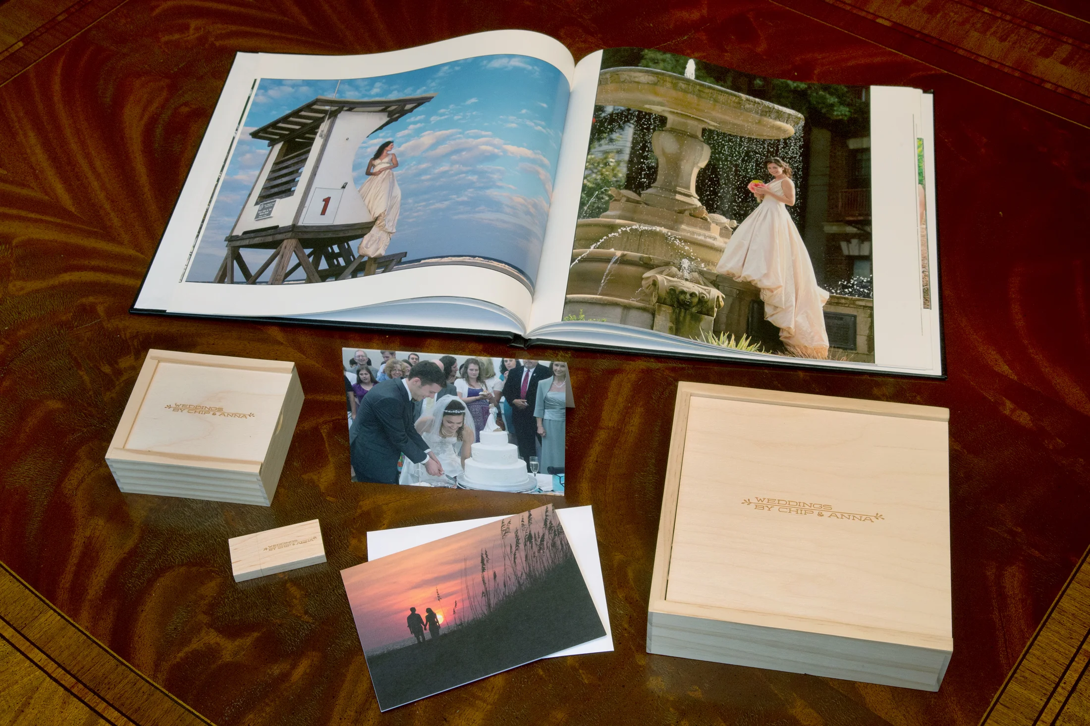 This package includes both a 3 hour engagement session and a 3 hour bridal portrait at the location of your choice. (Travel outside of the Triangle area will necessitate travel costs and charges) And some locations, ie., Duke Gardens , require a fee. From both of these sessions an on- line gallery is produced with a unique password from which you may choose up to 15 images per session that will be processed and retouched and delivered on a personalized flash drive. Additional photos available upon request. The Wedding day aspect of this package begins with two photographers capturing the moment you show up at your wedding location, getting ready with your bridal party, formal photos, ceremony, reception, cake cutting, toasts, first dance, bouquet and garter toss, until the time you leave out the door in your getaway car exhausted & happy. All edited images will be displayed on an on-line gallery and the couple will receive a large custom engraved wooden box with 100 processed and retouched prints of their choosing- finely printed on German watercolor paper. The couple will also receive a custom made wedding album telling the story of their wedding day as well as cards made from the photos of their wedding. They will also receive 125 images on a customized flash drive as well as all the additional images from the photography sessions and wedding. Maximum of 8 hours/ additional hours available @ $250 per hour which includes both photographers.